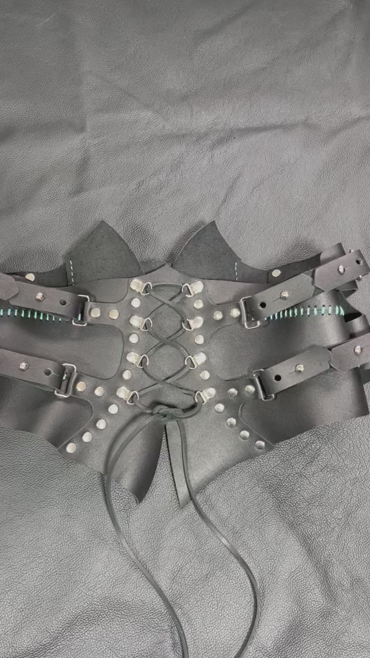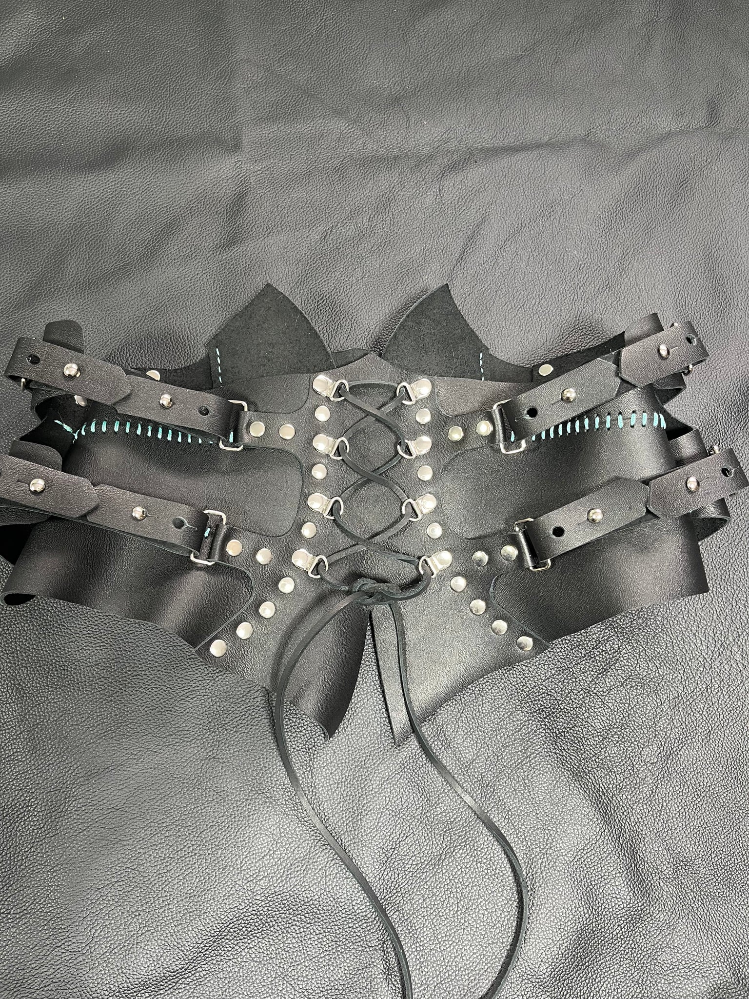 Eight corset eyelets to allow for perfect adjustment. Turquoise stitching on black leather.