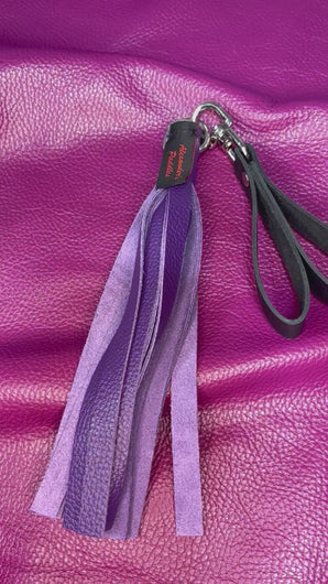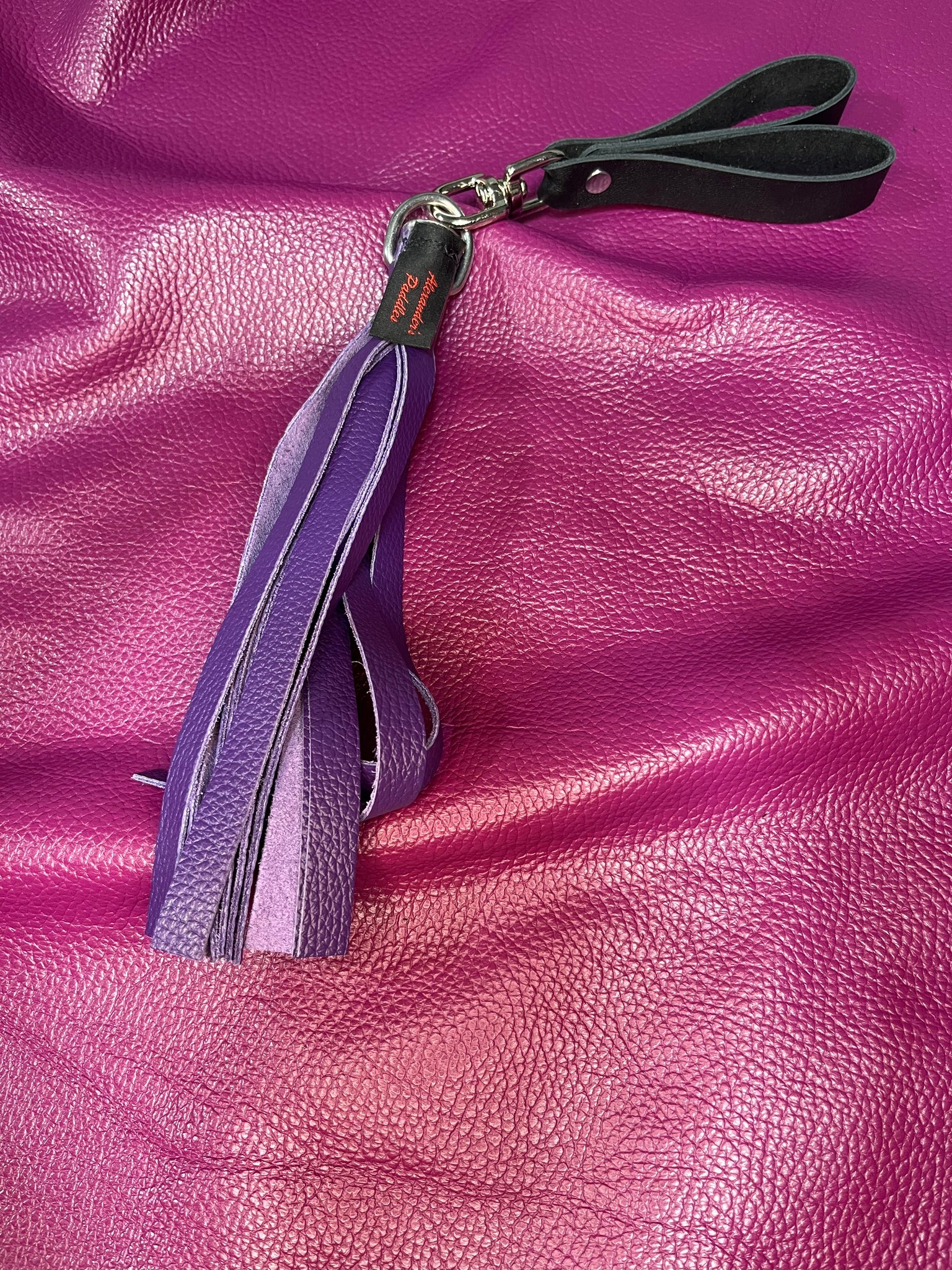 Purple and black leather mini flogger. At 15.5” in total length, 9” fall length and 1/4 the amount of leather of my regular floggers, this flogger gives you bang for your buck. You’ll get a decent sensation for the size, and the best part is it’s easily accessible and easy to store. Call it a fringe, and it’ll be hidden in plain sight!