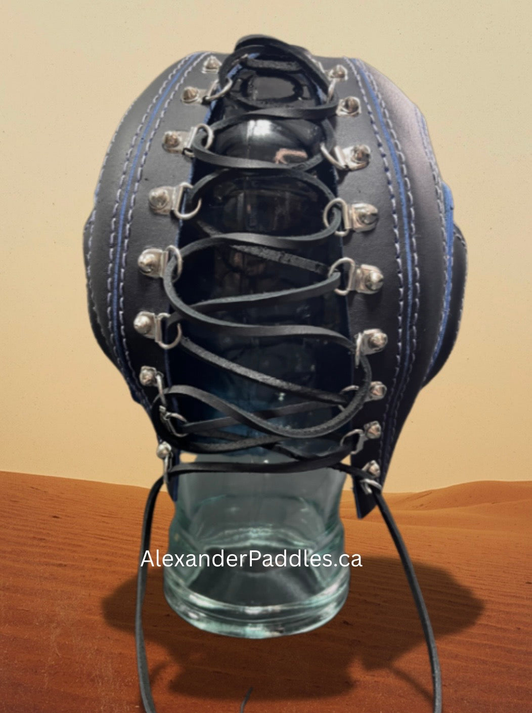 Hand sewn black leather hood with blue and white thread. The backside of the leather is blue, creating subtle blue accents around the edges of the joins.