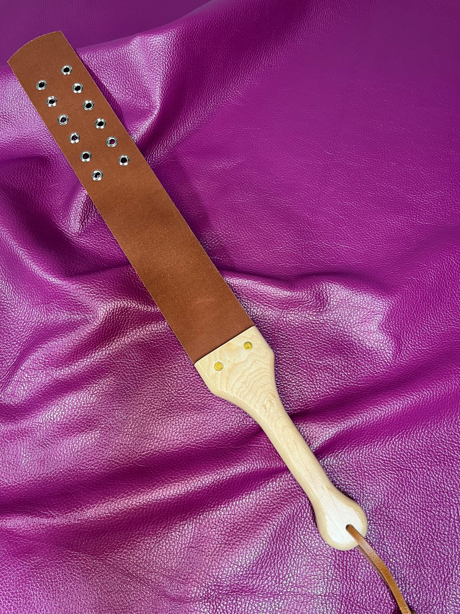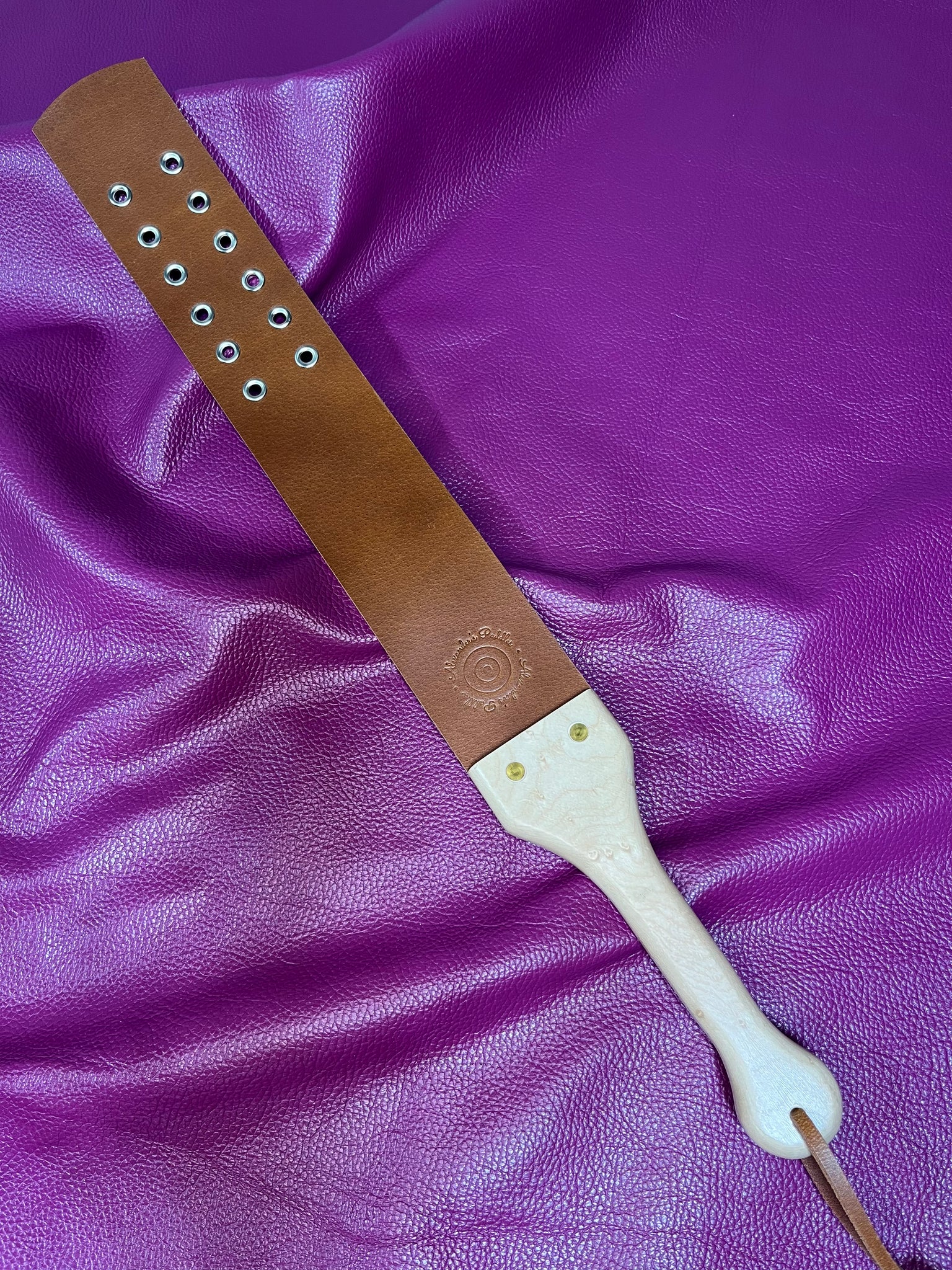 This strap is perfect for those who love the experience but prefer a less intense sensation. Lightweight and easy to swing for the top. Single layer of full grain leather with 12 grommets. Bird’s eye maple with brass hardware.